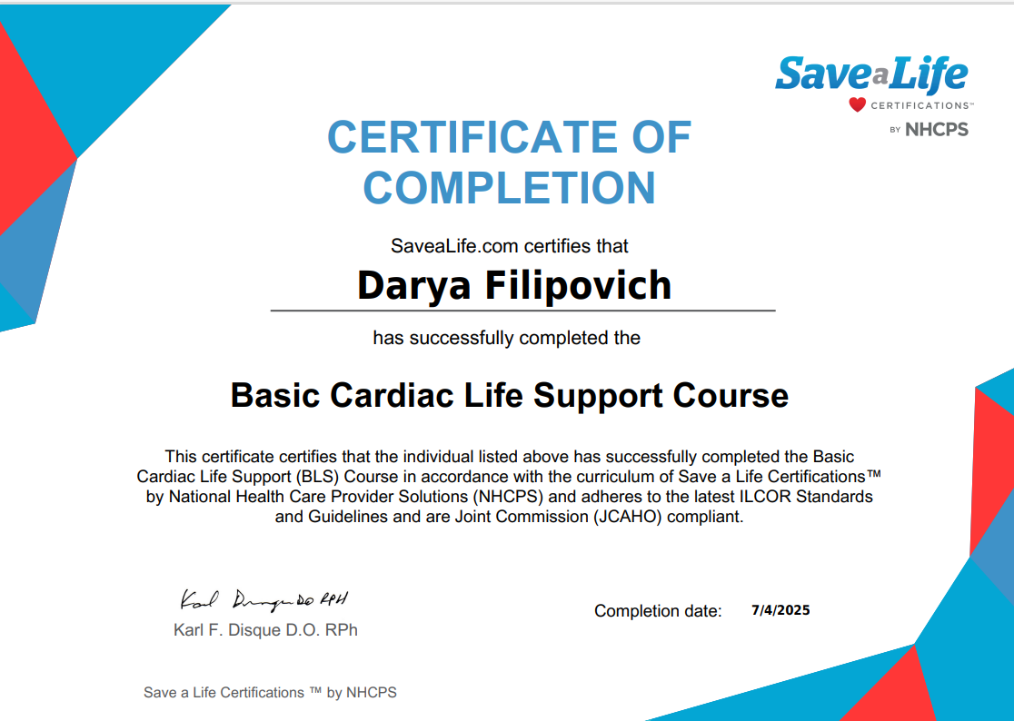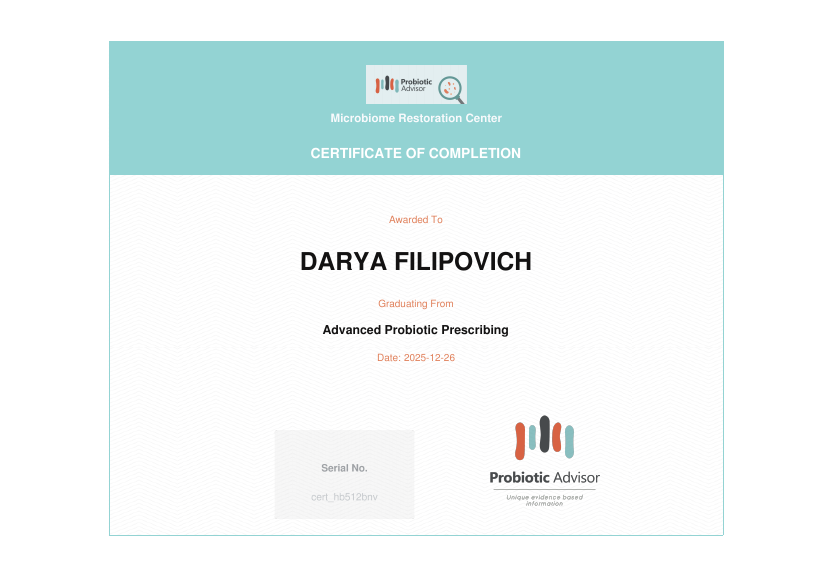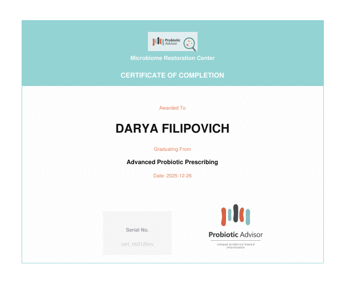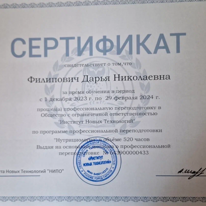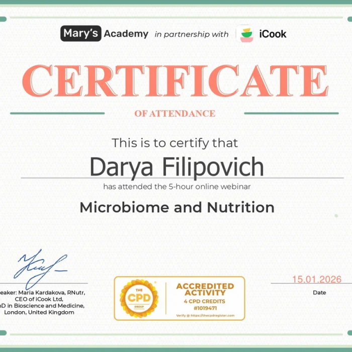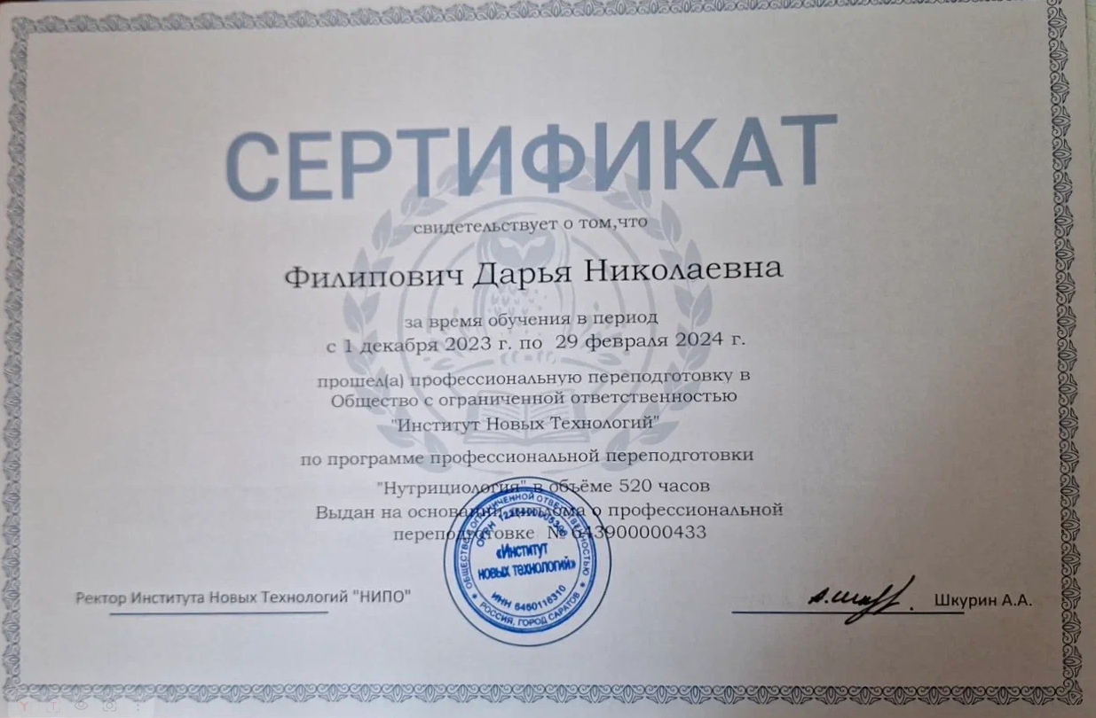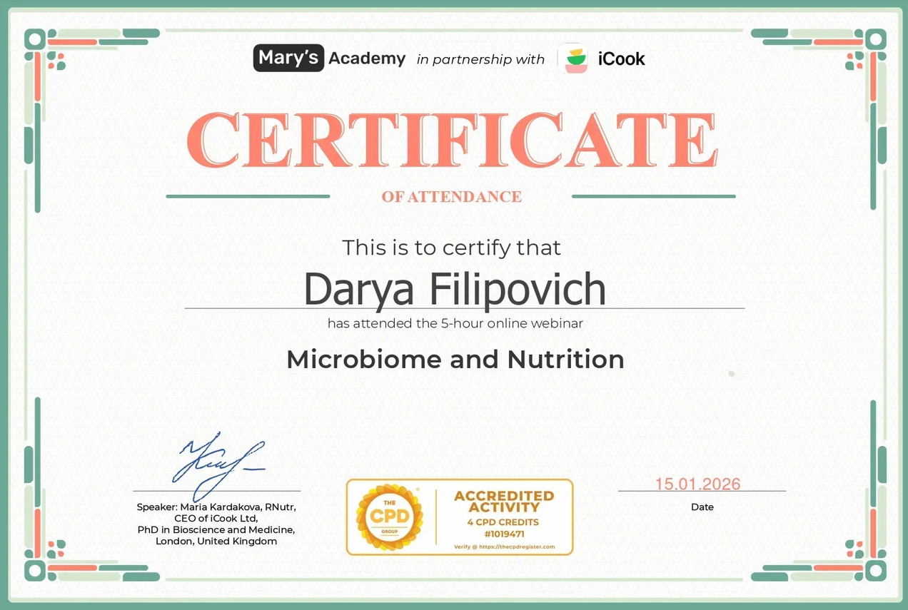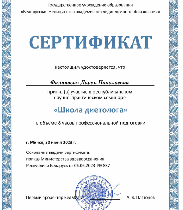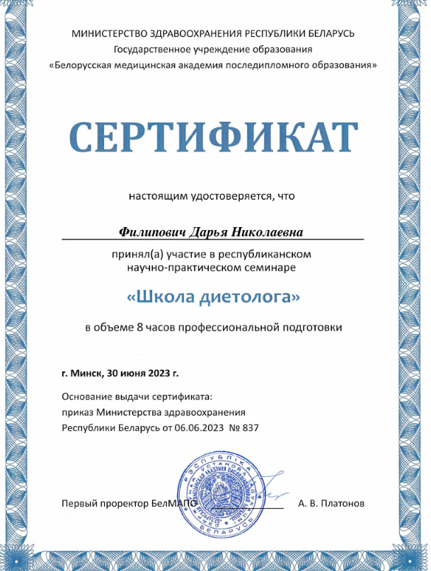 • 2023: Курс повышения квалификации «Школа нутрициолога», Белорусская медицинская академия последипломного образования (Беларусь)