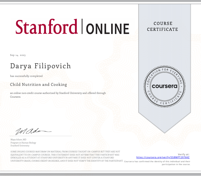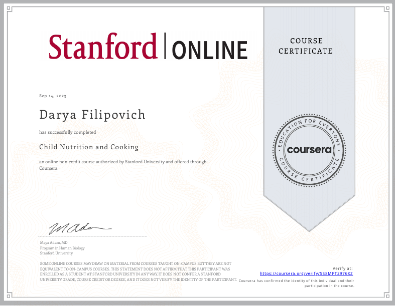 • 2023: Детское питание и кулинария, Stanford School of Medicine (США)