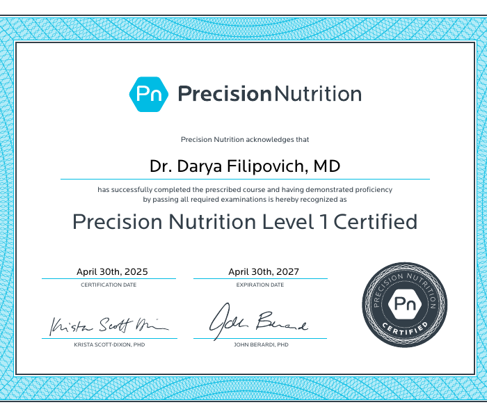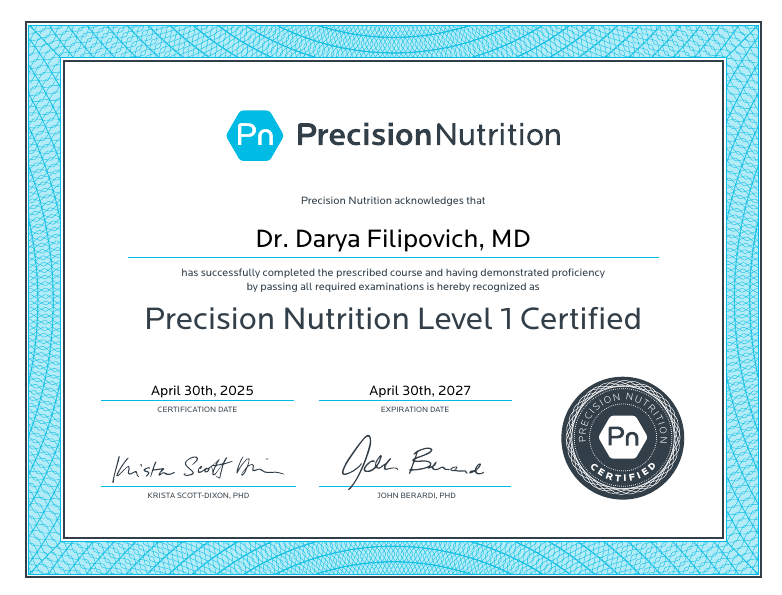 • 2024–2025: PN Level 1 Nutrition Coaching Certification, Precision Nutrition Inc. (Канада)