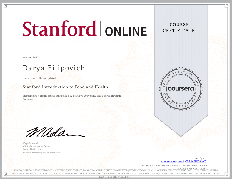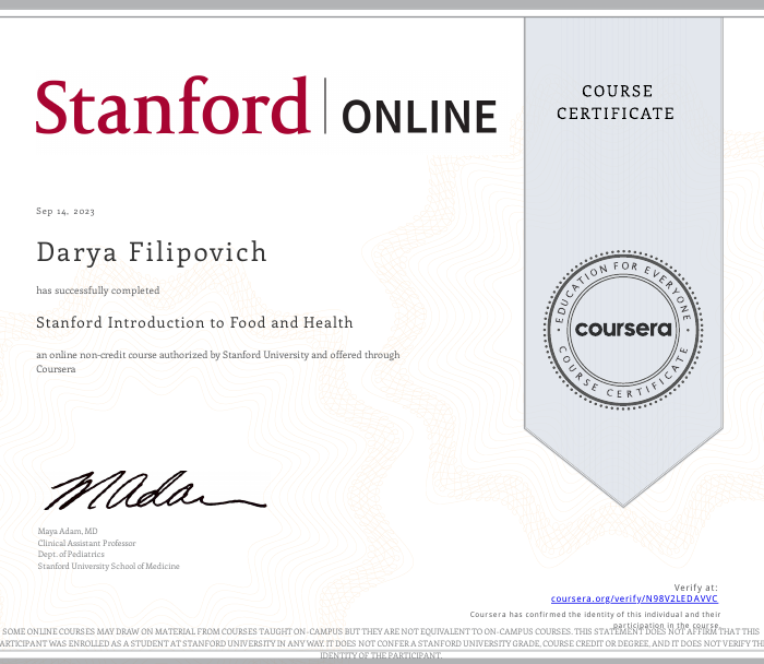• 2023: Введение в питание и здоровье, Stanford School of Medicine (США)