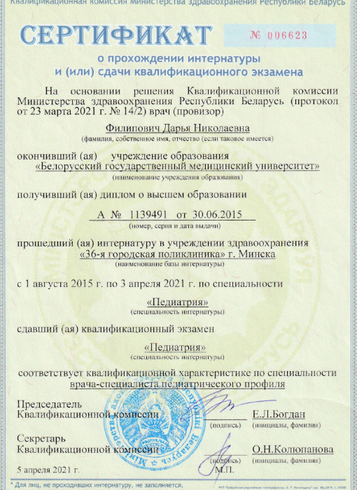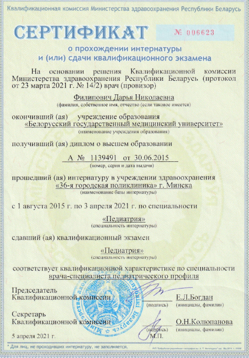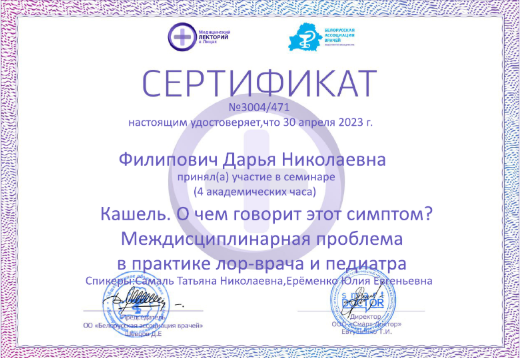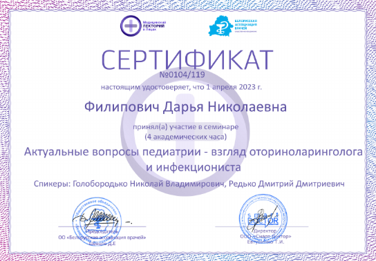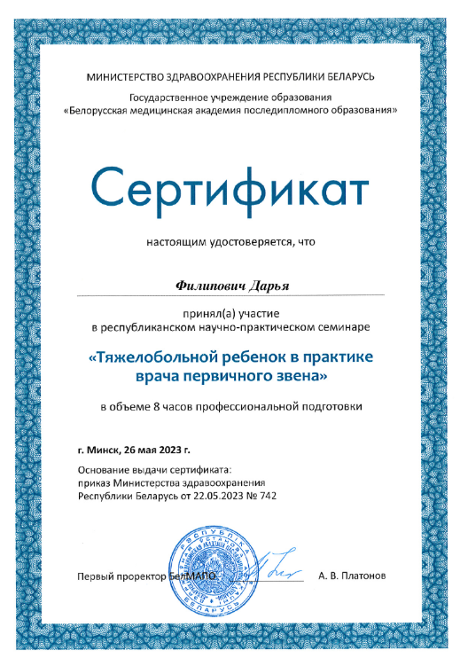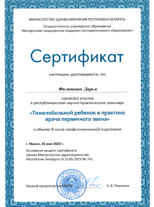 • 2023: Курс «Тяжело больной ребенок в практике врача первичной помощи», Белорусская медицинская академия последипломного образования (Беларусь)