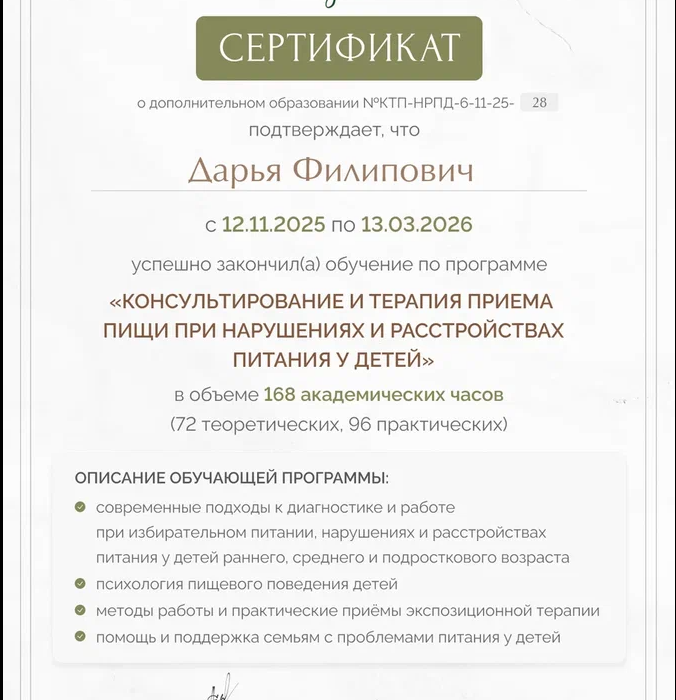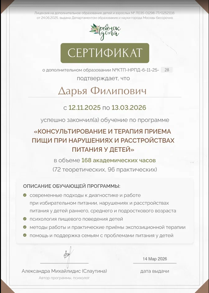 • 2025–2026: Консультирование и терапия приема пищи при расстройствах питания у детей